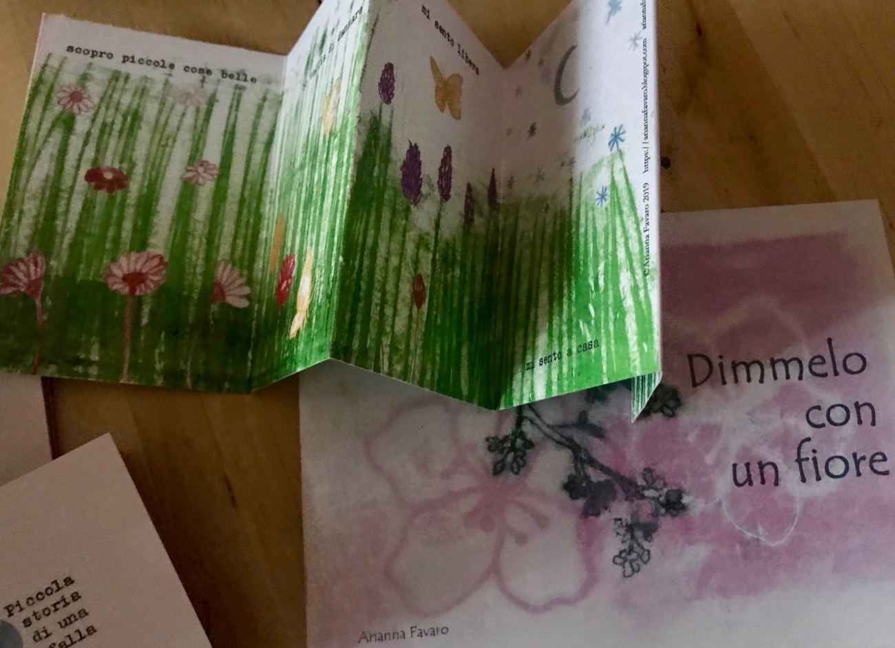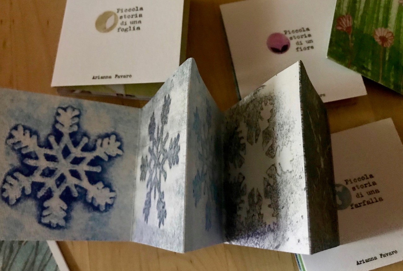 Ci sono i piccoli libri a fisarmonica, o leporelli, “piccola storia” li chiama l’autrice, e, che sia un fiore o un fiocco di neve, l’immersione nella natura è lieve e delicata,