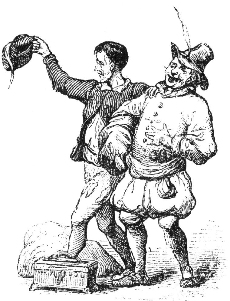 Giunse l’imperatore in persona con i suoi più nobili cavalieri, ed entrambi i truffatori sollevarono un braccio come se tenessero qualcosa e dissero: