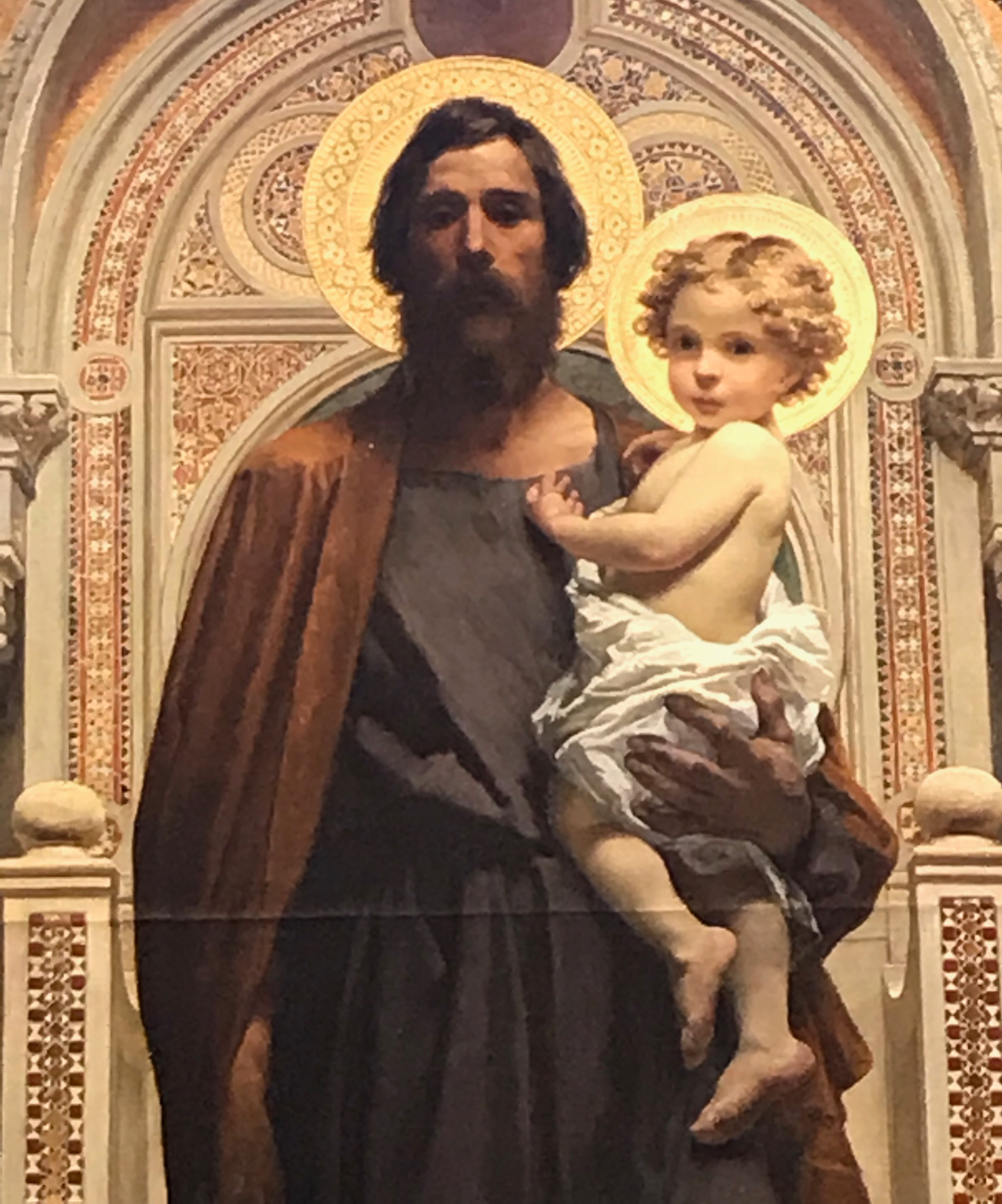 - Il quadro è del pittore Francesco Grandi vissuto a Roma tra il 1831 e il 1891. È una pala d’altare che raffigura San Giuseppe con Gesù Bambino. Dipinta nel 1891 per la Basilica di san Pietro in Vaticano, fu donata nel 1963 da Papa Giovanni XXII al santuario della Beata Vergine del Soccorso di Ossuccio, sul lago di Como, ed è qui che l’ho scoperta.