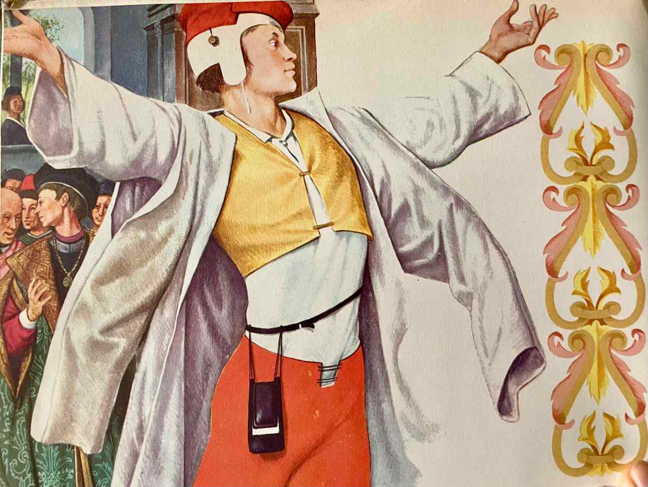 Uscito dal castello si diresse verso la campagna, nella speranza che l’aria dei boschi, a cui era abituato, gli portasse una buona ispirazione. E in fondo a una stradicciola, seduta sotto un albero, vide una vecchia che gli chiese l’elemosina.