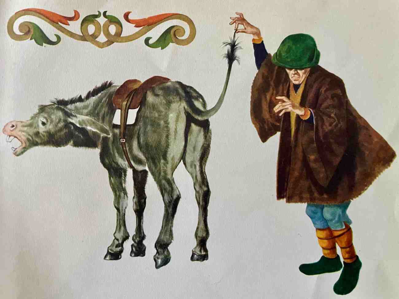 Re Pompone divenne rosso come un pomodoro: nessuno mai aveva osato rivolgergli una richiesta simile! Esitò parecchio: ma a mali estremi, estremi rimedi! Per consolarsi pensò: “Sono travestito da boscaiolo e nessuno ne saprà mai nulla”. E con un sospiro alzò la coda dell’asino e fece quanto gli era stato richiesto. Così ebbe la lepre, la mise in una tasca della logora palandrana e si allontanò.