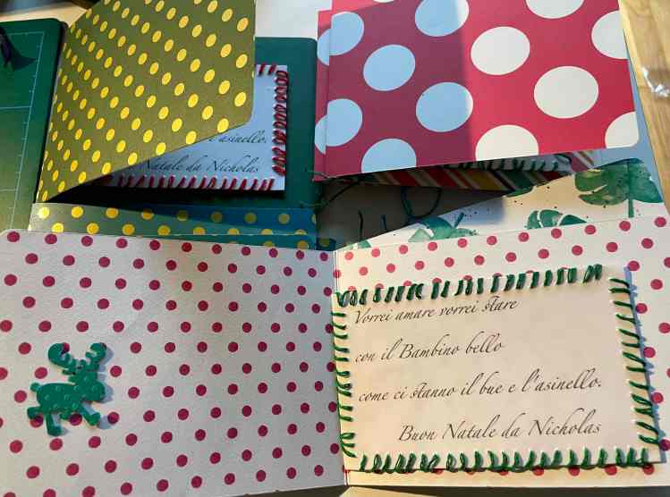 E poi è arrivato mio nipote Nicho a fare “lavoretti di Natale” e ho visto perché tutto è così profumato. Negli occhi di un bambino di 10 anni l’ho visto. Il lavoretto di Nicho era comporre biglietti natalizi per le famiglie presenti al pranzo di Natale, 26 persone, 12 famiglie. Cartoncini colorati, fogli plastificati, eccoci armati di forbici, taglierina, ago e filo con cui fare le cornicette ai biglietti, ma soprattutto eccoci pronti a scegliere la frase da stampare sul biglietto.